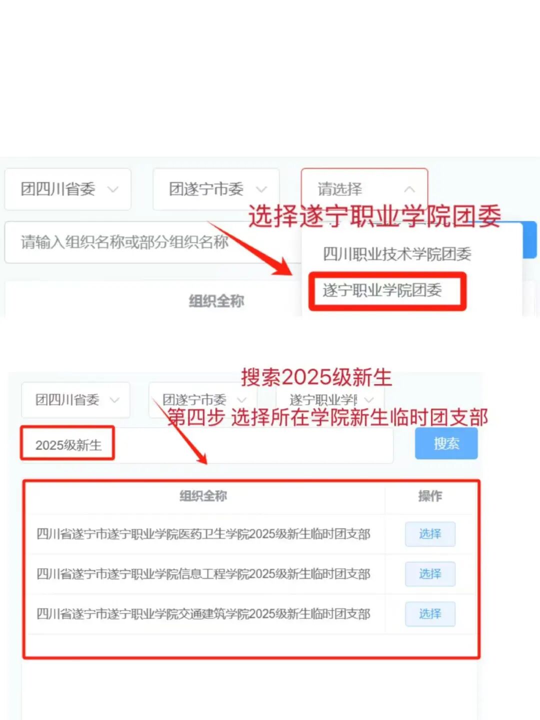 在搜索组织时,先选定省级组织,市级组织,接着选定遂宁职业学院团委,再使用搜索功能,搜索时请使用团组织全称。