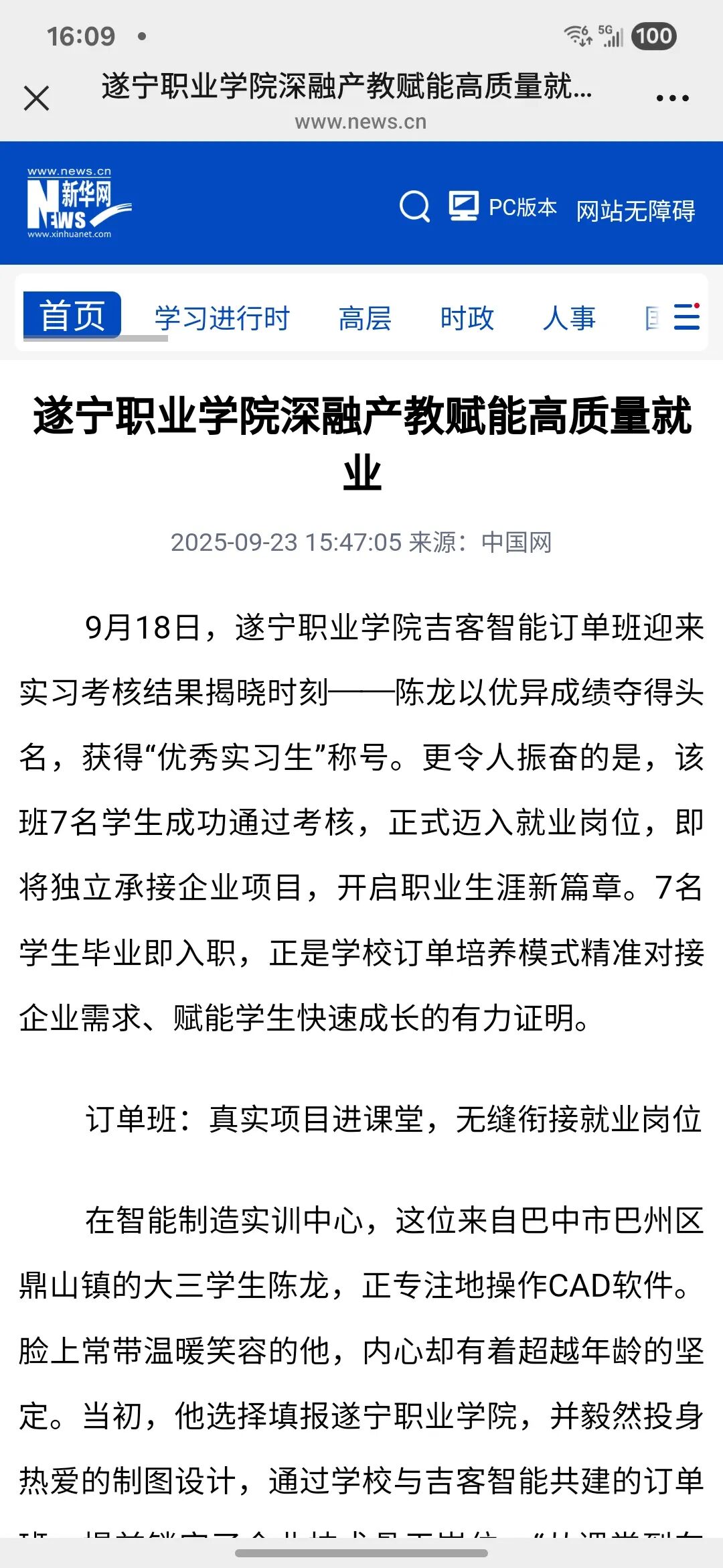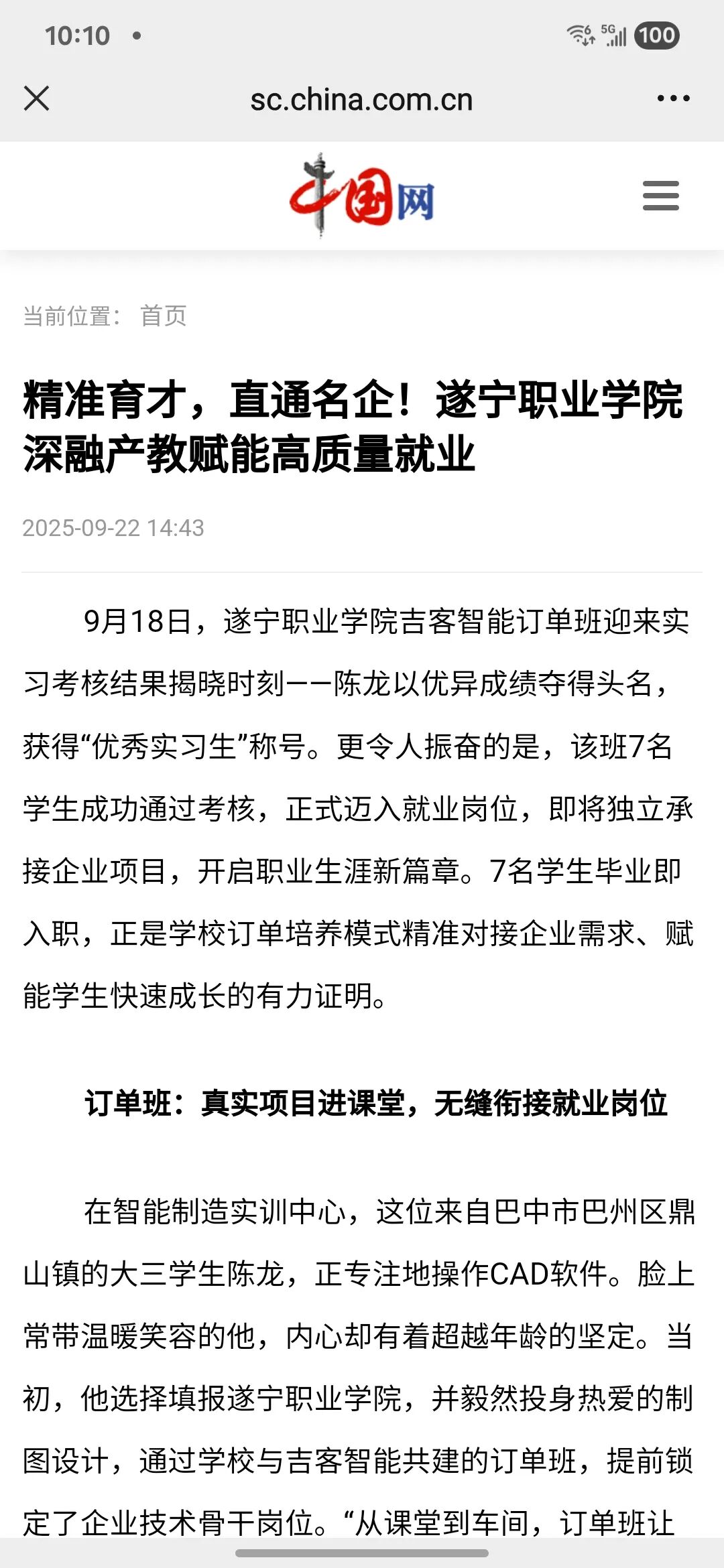近日,新华网、中国网、中国日报等多家主流媒体集中报道了遂宁职业学院以“精准育才,直通名企”为核心的产教融合实践,生动展现了学校通过“订单班”培养与“微专业”设置,有效赋能学生高质量就业的创新路径。报道引发广泛关注,彰显了学院在服务区域经济发展与保障学生高质量就业方面取得的显著成果。