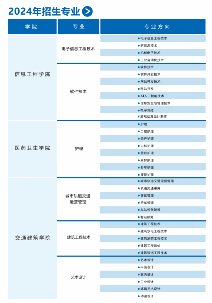 学院开设有软件技术专业、电子信息工程技术专业,专业方向有软件技术、软件开发技术、网站开发技术、网站开发、AI人工智能技术、信息安全与管理技术、电子竞技、游戏动漫设计与制作、电子信息工程技术、新能源技术、机械电子技术、工业自动化技术。学院师资力量雄厚,专任教师由学校教师+企业工程师+行业专家构成,现有专职教师18人,具有企业工作经验的教师9人,行业专家3人,其中高职称教师4人,双师型教师6人。